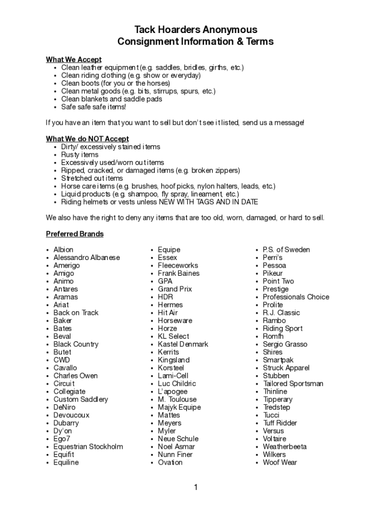 Tack Hoarders Anonymous Consignment Information & Terms What We Accept Clean leather equipment (e.g. saddles, bridles, girths, etc.) Clean riding clothing (e.g. show or every day) Clean boots (for