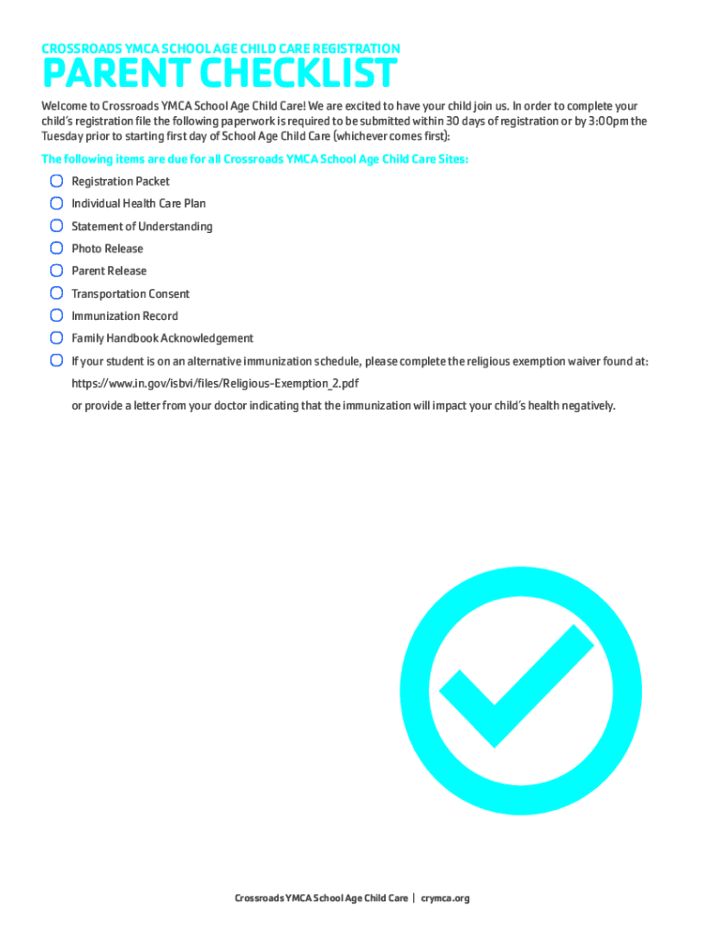 CROSSROADS YMCA SCHOOL AGE CHILD CARE REGISTRATIONPARENT CHECKLISTWelcome to Crossroads YMCA School Age Child Care! We are excited to have your child join us. In order to complete your