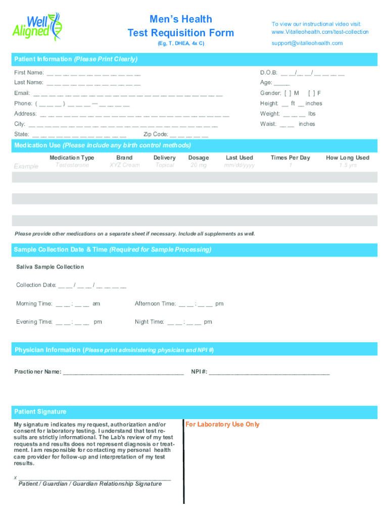 Men Health Test Requisition Form view our instructional video visit: www.Vitalleohealth.com/testcollectionsupport@vitalleohealth.com(EG, T, DHEA, 4x C)Patient Information (Please Print Clearly) First