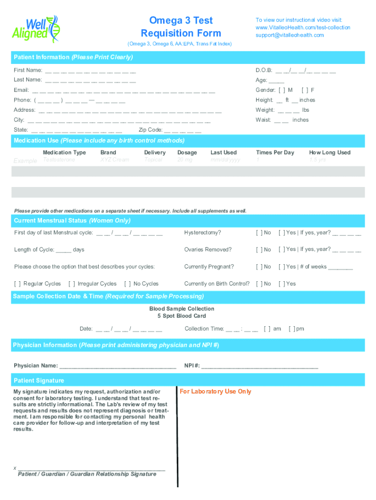 Omega 3 Test Requisition Form view our instructional video visit: www.VitalleoHealth.com/testcollection support@vitalleohealth.com(Omega 3, Omega 6, AA:EPA, Trans Fat Index)Patient Information (Please