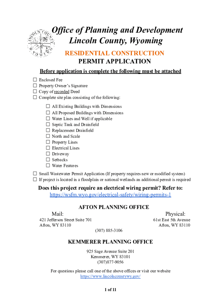 Office of Planning and Development Lincoln County, Wyoming RESIDENTIAL CONSTRUCTION PERMIT APPLICATION Before application is complete the following must be attached closed Fee E Property Owners Signature