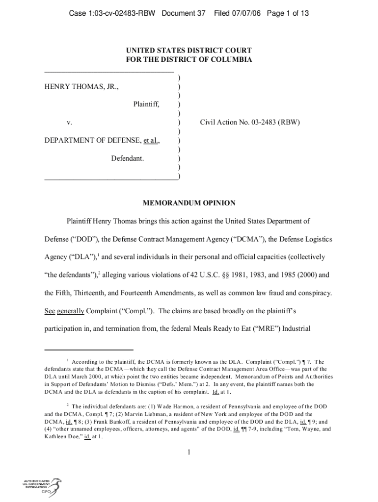 Case 1:03cv02483RBW Document 37Filed 07/07/06-Page 1 of 13UNITED STATES DISTRICT COURT FOR THE DISTRICT OF COLUMBIA ___) HENRY THOMAS, JR.,) ) Plaintiff,) ) v.) Civil Action No. 032483 (RAW)) DEPARTMENT