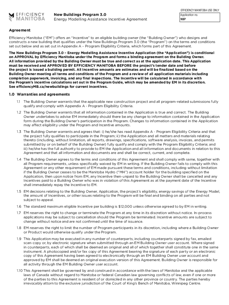 New Buildings Program 3.0 Energy Modelling Assistance Incentive AgreementEFFICIENCY MANITOBA USE ONLY Application no. NBPAgreement Efficiency Manitoba (EM) offers an Incentive to an eligible building