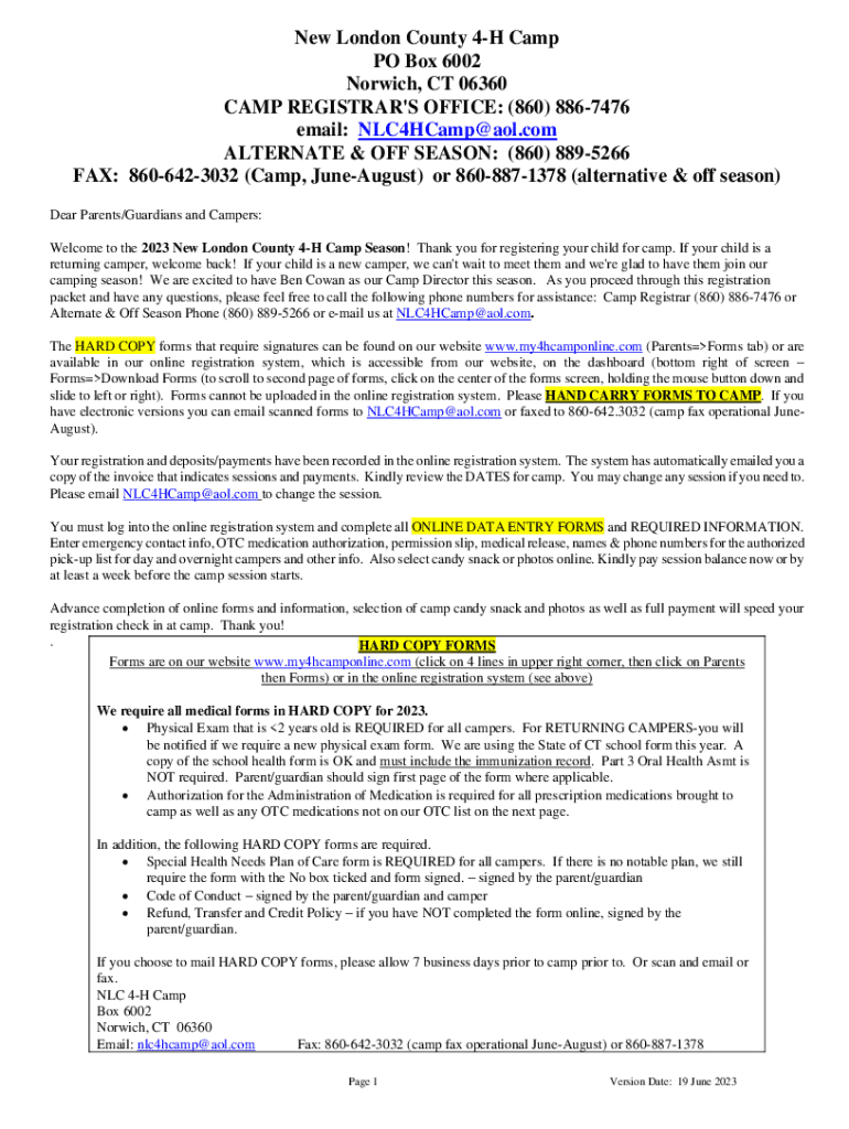 New London County 4H Camp PO Box 6002 Norwich, CT 06360 CAMP REGISTRAR\'S OFFICE: (860) 8867476 email: NLC4HCamp@aol.com ALTERNATE & OFF SEASON: (860) 8895266 FAX: 8606423032 (Camp, June August) or
