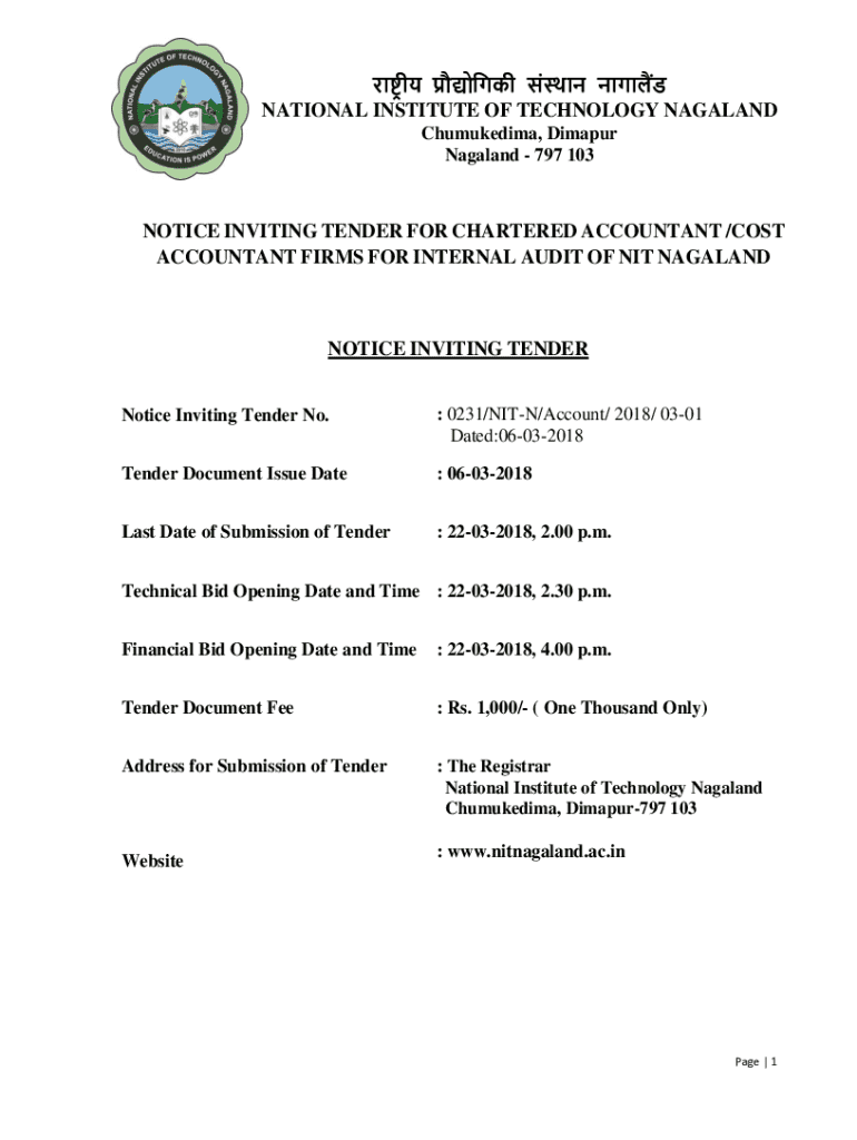 Nagaland 797 103NOTICE INVITING TENDER FOR CHARTERED ACCOUNTANT /COST