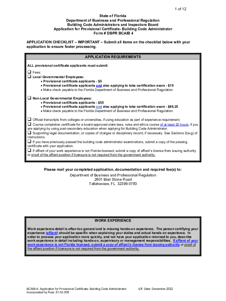 Get the free DBPR BCAIB 4 - Application for Provisional Certificate- Building Code Administrator