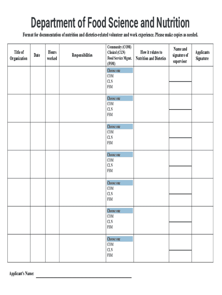 Department of Food Science and NutritionFormat for documentation of nutrition and dieteticsrelated volunteer and work experience. Please make copies as needed. Title of OrganizationDateHours workedResponsibilitiesCommunity
