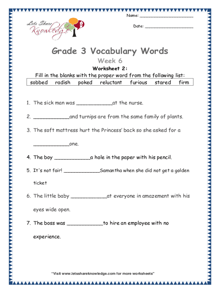 Name: ___ Date: ___Grade 3 Vocabulary Words Week 6 Worksheet 2: Fill in the blanks with the proper word from the following list: sobbed radish poked reluctant furious stared firm1. The sick man was