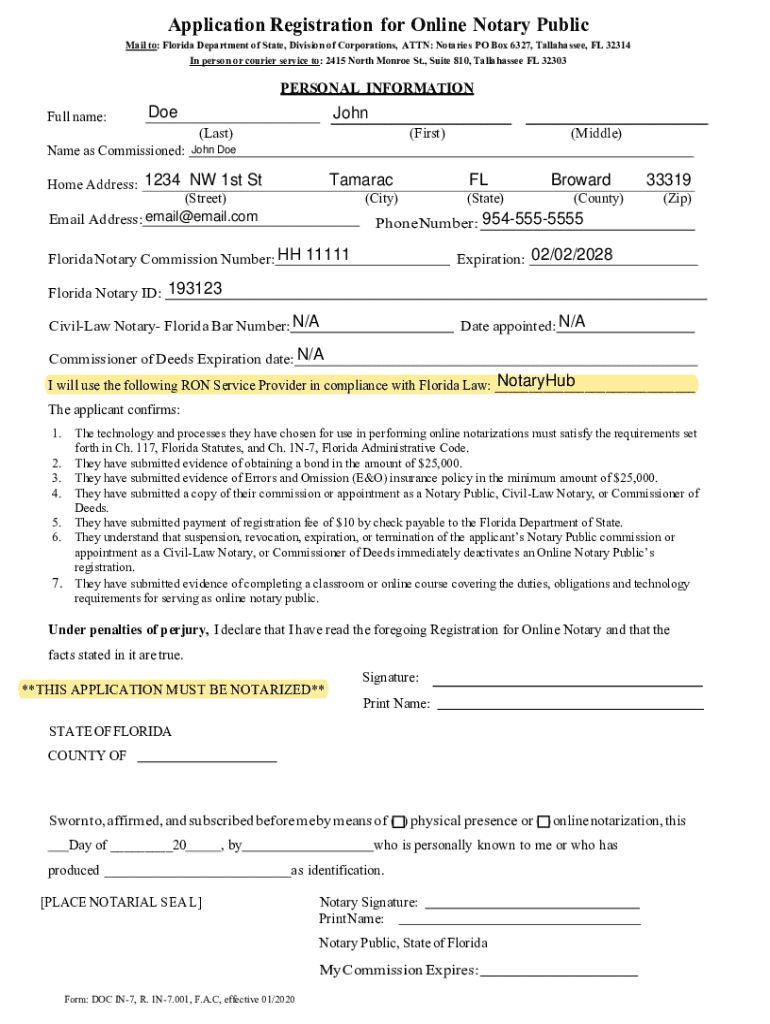 Application Registration for Online Notary Publican to: Florida Department of State, Division of Corporations, ATTN: Notaries PO Box 6327, Tallahassee, FL 32314
