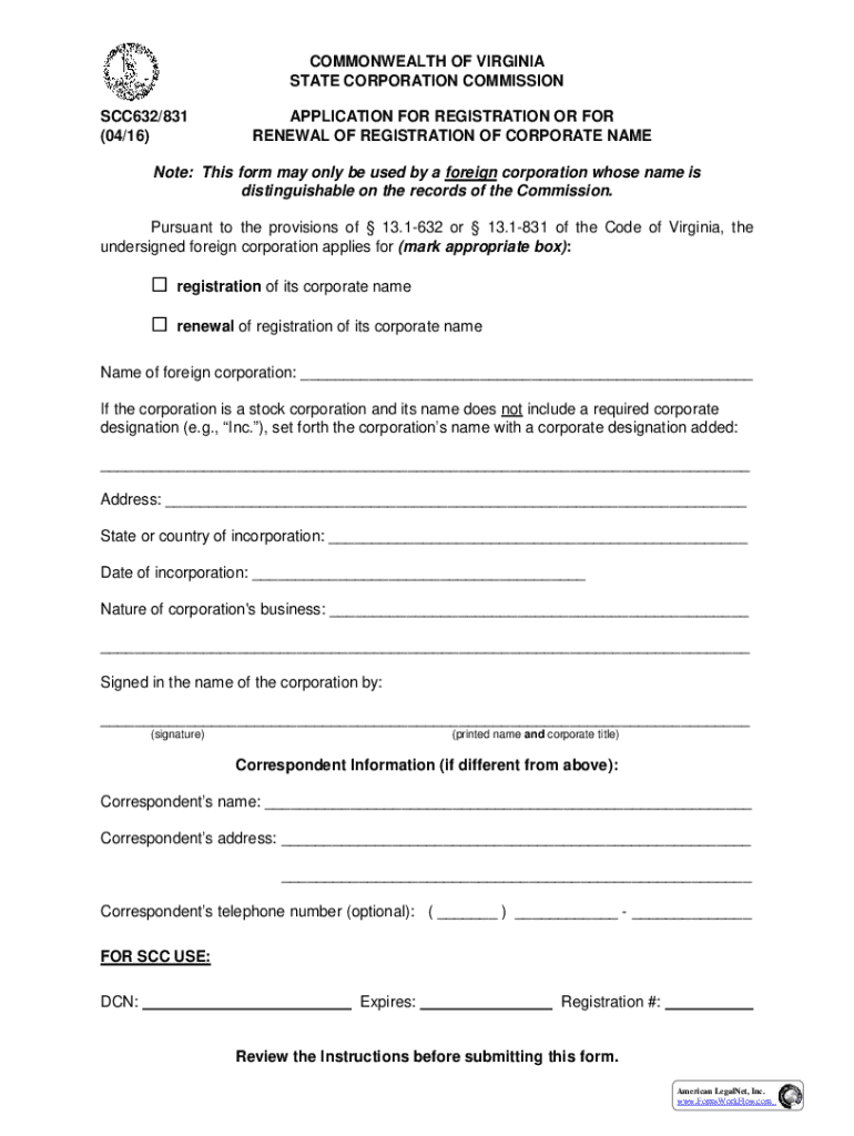 COMMONWEALTH OF VIRGINIA STATE CORPORATION COMMISSION SCC632/831 (04/16)APPLICATION FOR REGISTRATION OR FOR RENEWAL OF REGISTRATION OF CORPORATE Denote: This form may only be used by a foreign corporation