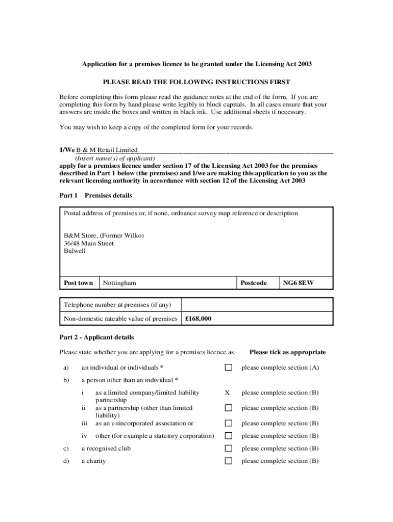 Application for a premises licence to be granted under the Licensing Act 2003 PLEASE READ THE FOLLOWING INSTRUCTIONS FIRST Before completing this form please read the guidance notes at the end of