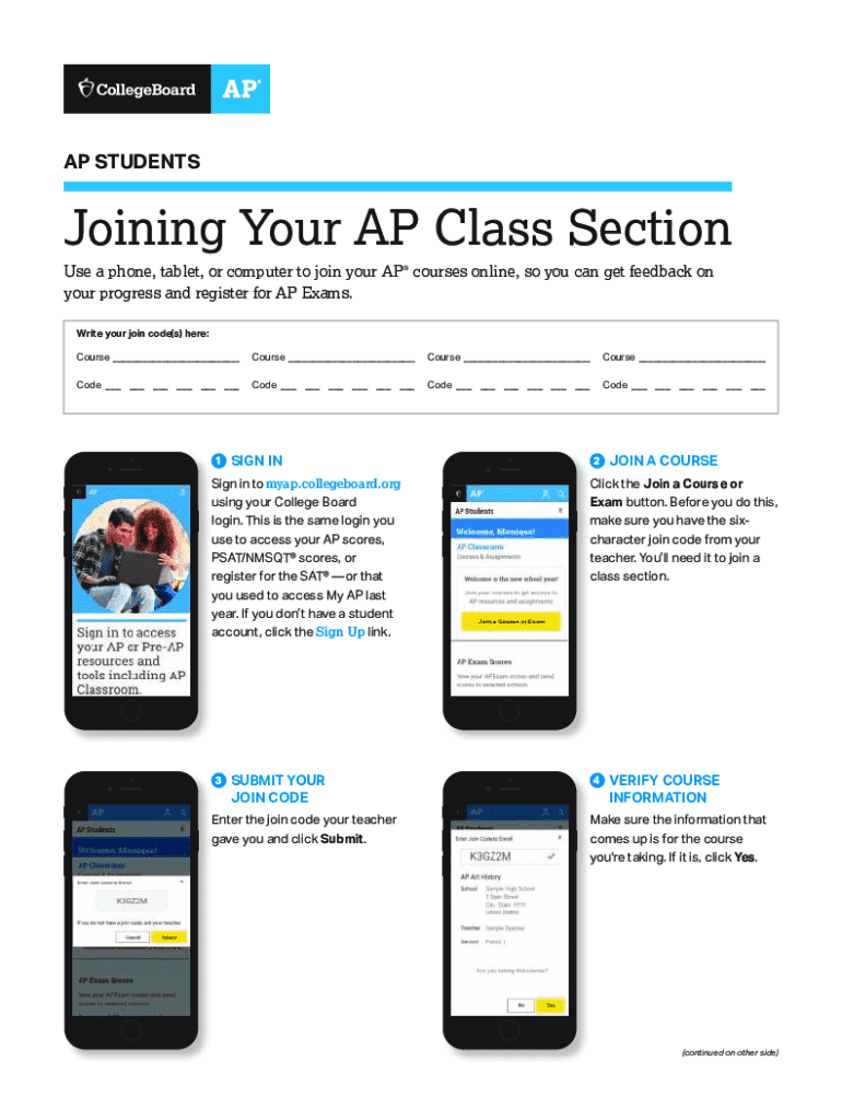 AP STUDENTSJoining Your AP Class Section Use a phone, tablet, or computer to join your AP courses online, so you can get feedback on your progress and register for AP Exams. Write your join code(s)