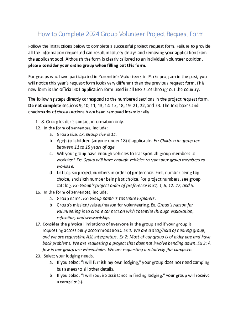 How to Complete 2024 Group Volunteer Project Request Form Follow the instructions below to complete a successful project request form. Failure to provide all the information requested can result in
