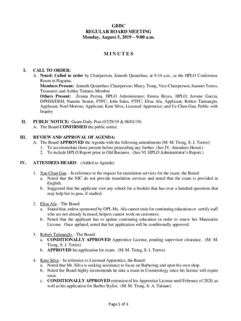 Monday, August 5, 2019 9:00 a.m.MINUTES.II.CALL TO ORDER: