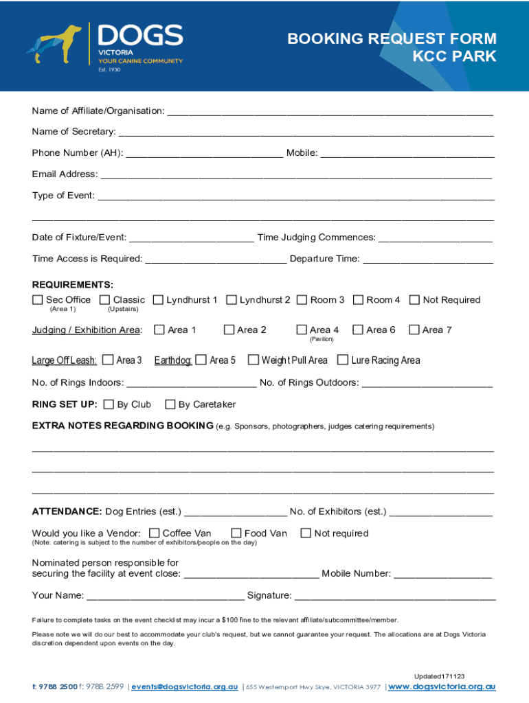 BOOKING REQUEST FORM KCC PARKName of Affiliate/Organisation: ___ Name of Secretary: ___ Phone Number (AH): ___ Mobile: ___ Email Address: ___ Type of Event: ___ ___ Date of Fixture/Event: ___ Time