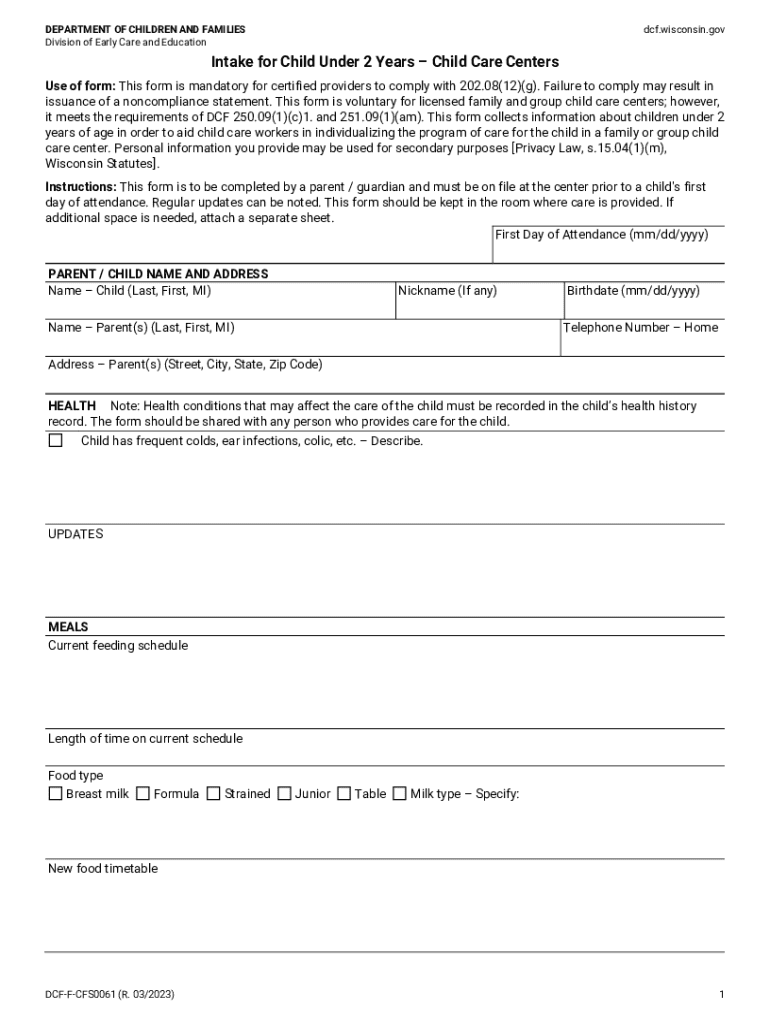 DEPARTMENT OF CHILDREN AND FAMILIES Division of Early Care and Educationdcf.wisconsin.govIntake for Child Under 2 Years Child Care Centers Use of form: This form is mandatory for certified providers