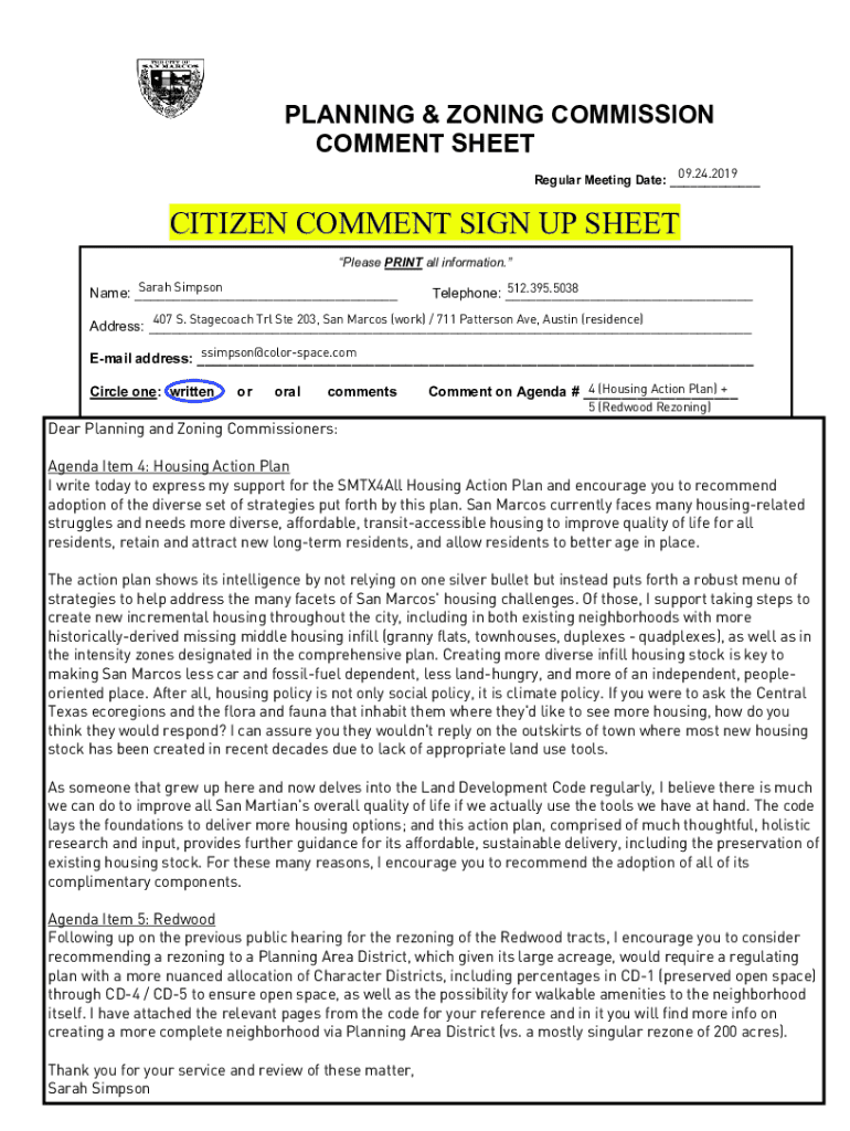 PLANNING & ZONING COMMISSION COMMENT SHEET 09.24.2019 Regular Meeting Date: ___CITIZEN COMMENT SIGN UP SHEET Please PRINT all information. Sarah Simpson Name: ___512.395.5038 Telephone: ___407 S.