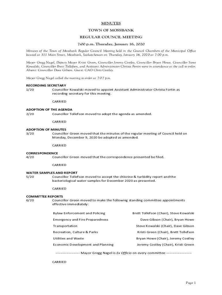 Minutes of the Town of Mossback Regular Council Meeting held in the Council Chambers of the Municipal Office