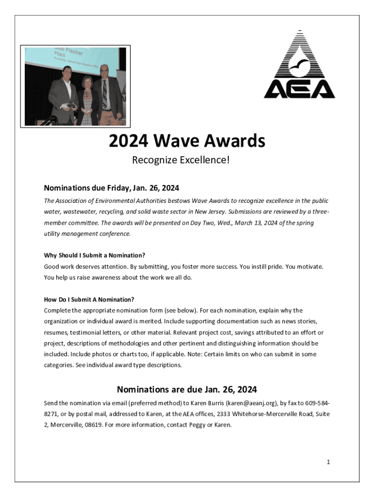 2024 Wave Awards Recognize Excellence! Nominations due Friday, Jan. 26, 2024 The Association of Environmental Authorities bestows Wave Awards to recognize excellence in the public water, wastewater,