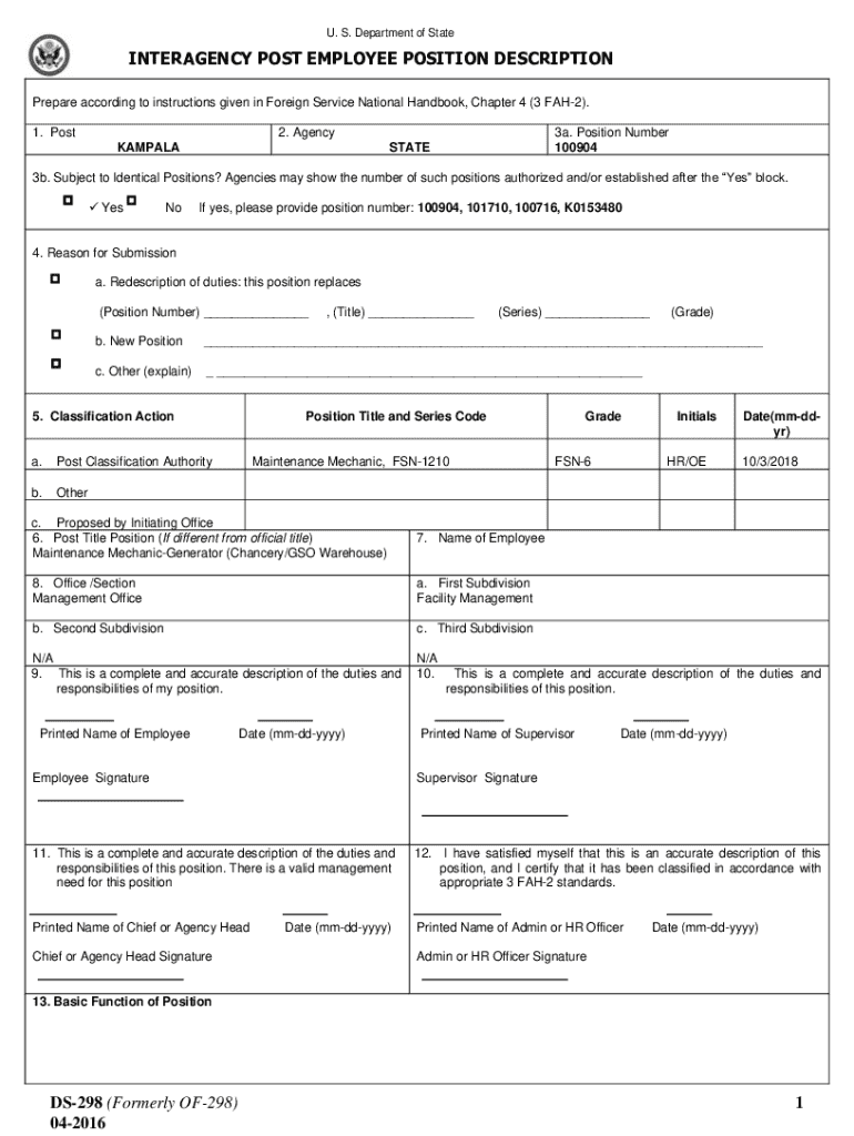 U. S. Department of StateINTERAGENCY POST EMPLOYEE POSITION DESCRIPTION Prepare according to instructions given in Foreign Service National Handbook, Chapter 4 (3 FAH2). 1. Post2. Agency KAMPALA3a.