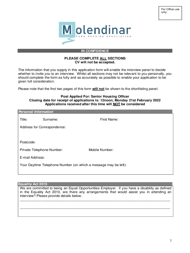 For Office use only:IN CONFIDENCE PLEASE COMPLETE ALL SECTIONS CV will not be accepted. The information that you supply in this application form will enable the interview panel to decide whether to