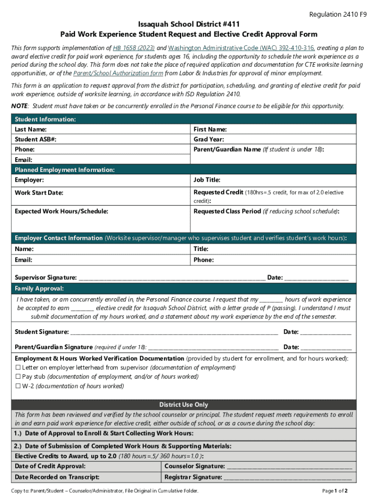 Regulation 2410 F9Issaquah School District #411 Paid Work Experience Student Request and Elective Credit Approval FormThis form supports implementation of HB 1658 (2023) and Washington Administrative