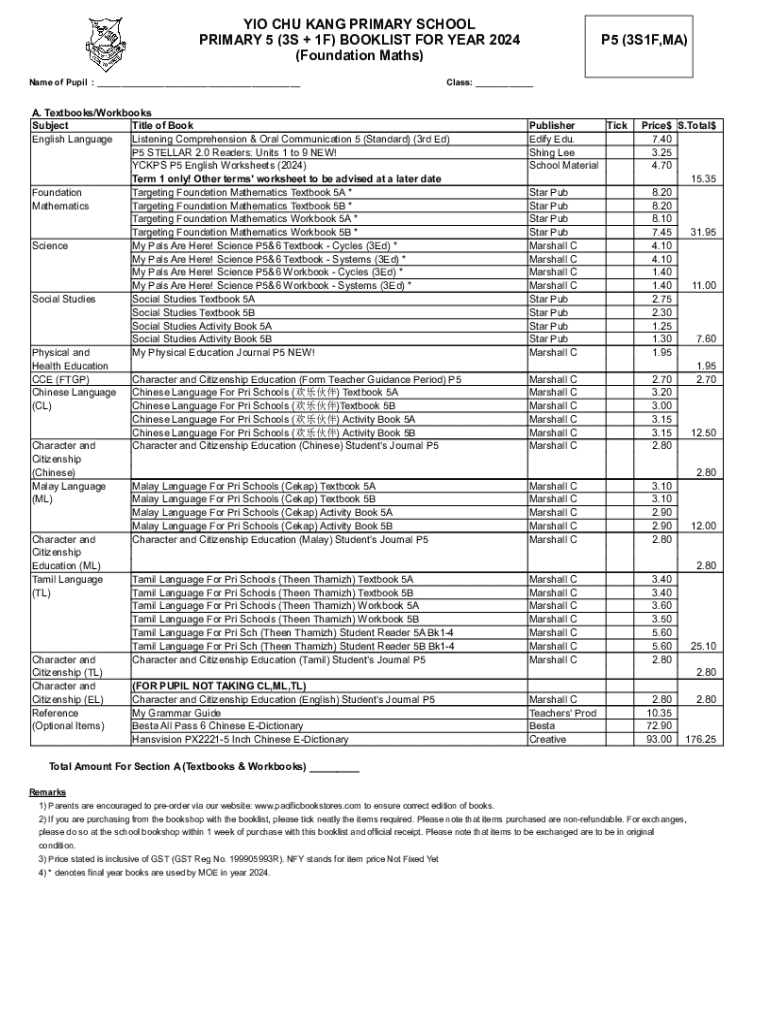 YIO CHU KANG PRIMARY SCHOOL PRIMARY 5 (3S + 1F) BOOKLIST FOR YEAR 2024 (Foundation Maths) Name of Pupil : ___P5 (3S1F,MA)Class: ___A. Textbooks/Workbooks Subject Title of Book English Language Listening
