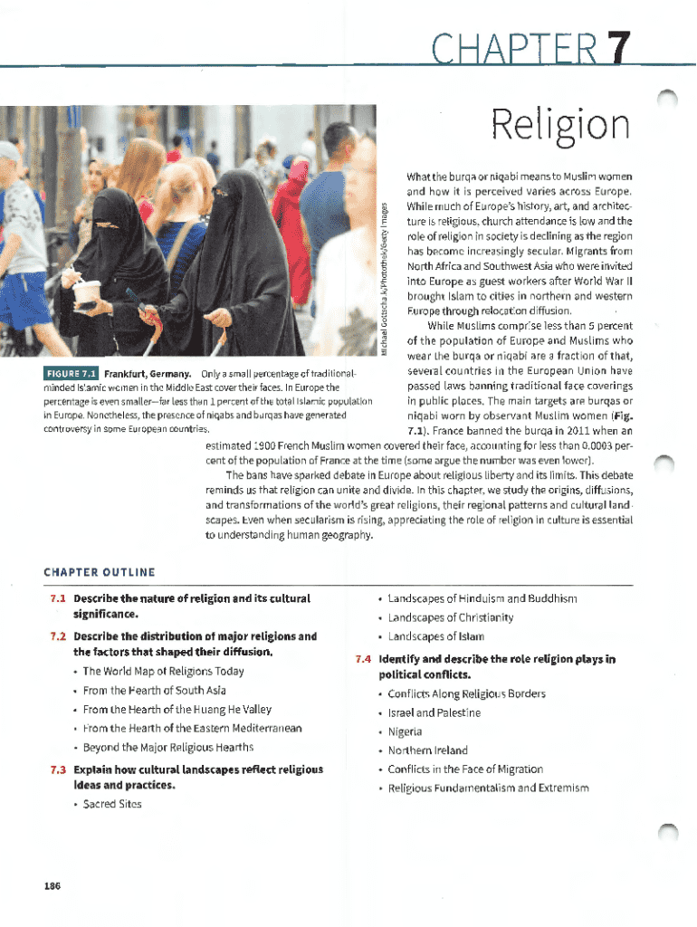 CHAPTER 7 Religion What the burqa or niqabi means to Muslim women and how it is perceived varies across Europe. While much of Europe\'s history, art, and architecture is religious, church attendance
