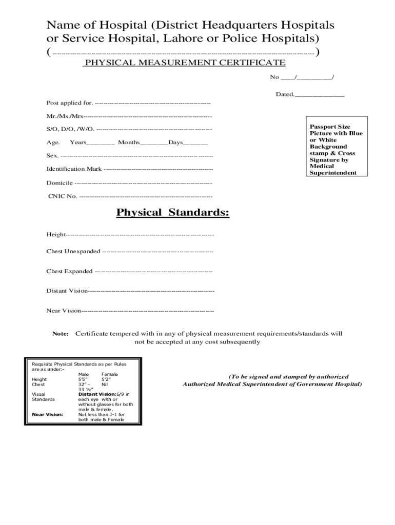 Name of Hospital (District Headquarters Hospitals or Service Hospital, Lahore or Police Hospitals) ( ) PHYSICAL MEASUREMENT CERTIFICATE No ___/___/ Dated.___ Post applied for. Mr./Ms./MrsS/O, D/O,