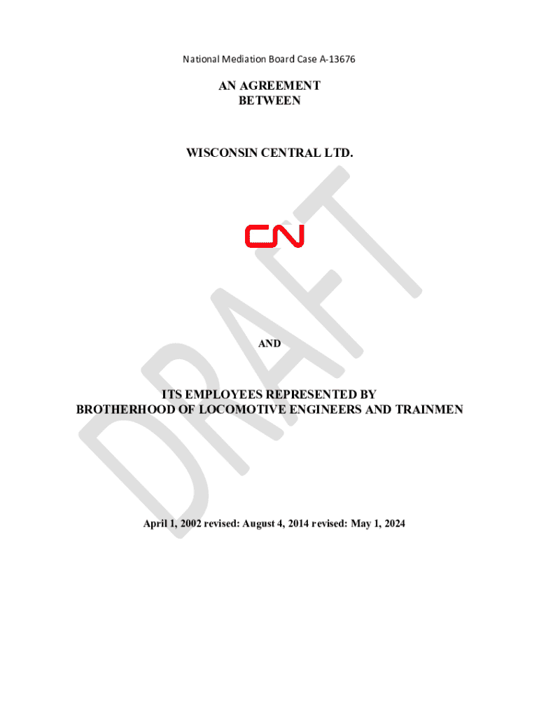 National Mediation Board Case A13676AN AGREEMENT BETWEENWISCONSIN CENTRAL LTD.ANDITS EMPLOYEES REPRESENTED BY BROTHERHOOD OF LOCOMOTIVE ENGINEERS AND TRAINMENApril 1, 2002 revised: August 4, 2014