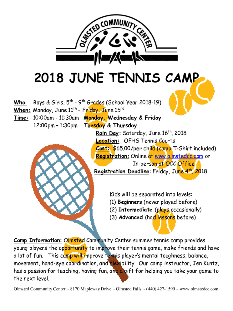 2018 JUNE TENNIS CAMP Who: Boys & Girls, 5th 9th Grades (School Year 201819) When: Monday, June 11th Friday, June 15rd Time: 10:00am 11:30am Monday, Wednesday & Friday 12:00pm 1:30pm Tuesday & Thursday