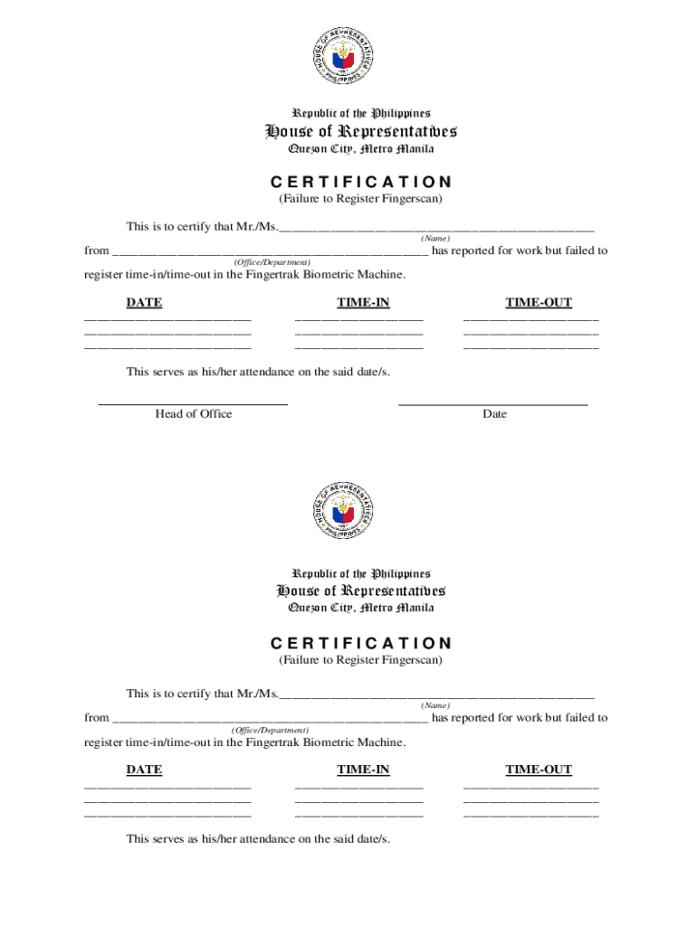 Republic of the PhilippinesHouse of Representatives Quezon City, Metro ManilaCERTIFICATION (Failure to Register Fingerscan) This is to certify that Mr./Ms.___ (Name)from ___ has reported for work