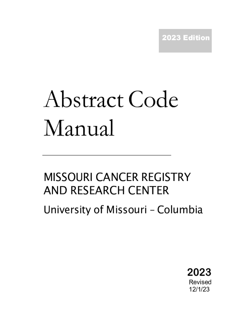 2023 EditionAbstract Code Manual MISSOURI CANCER REGISTRY AND RESEARCH CENTER University of Missouri Columbia2023Revised 12/1/23MCRARCABSTRACTCODEMANUALMissouri Cancer Registry and Research CenterAbstract