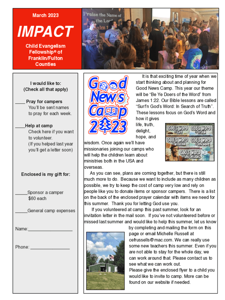 March 2023IMPACT Child Evangelism Fellowship of Franklin/Fulton CountiesI would like to: (Check all that apply) ___ Pray for campers Youll be sent names to pray for each week. ___Help at camp Check