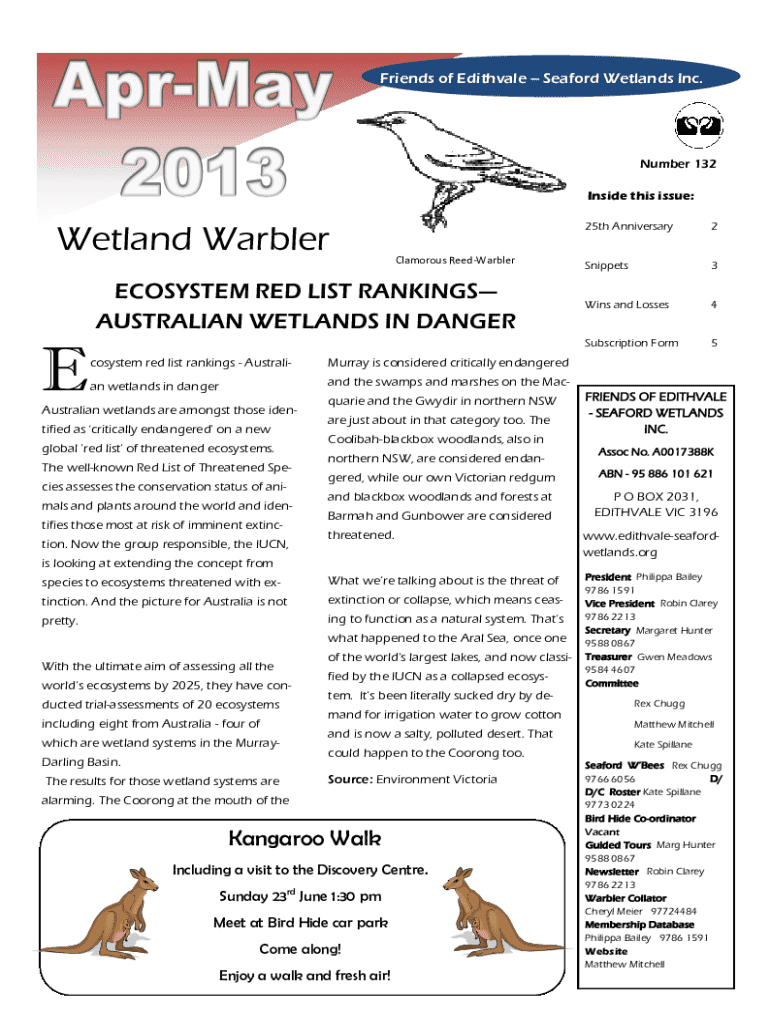 Friends of Edithvale Seaford Wetlands Inc.Number 132 Inside this issue:Wetland WarblerEClamorous ReedWarblerECOSYSTEM RED LIST RANKINGS AUSTRALIAN WETLANDS IN DANGER cosystem red list rankings AustraliMurray