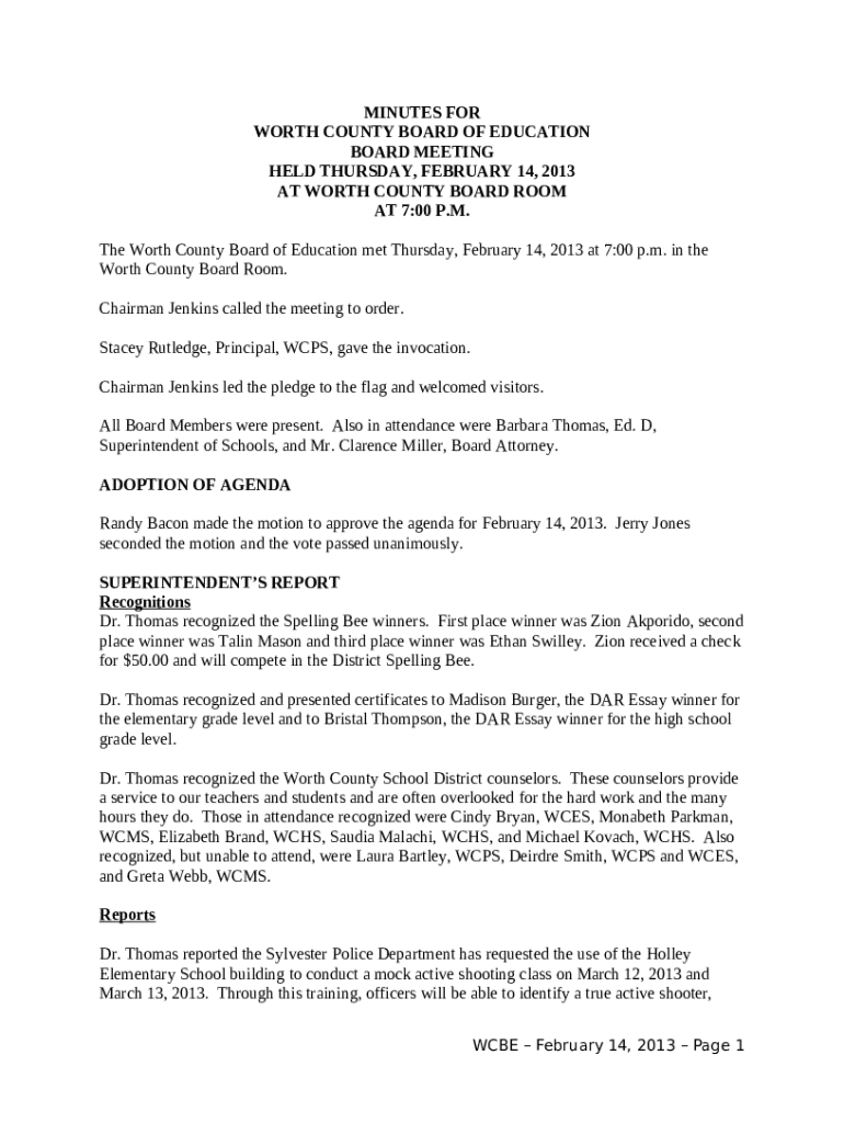 Instructions for the The Worth County Board of Education met Thursday, February 14, 2013 at 7:00 p form
