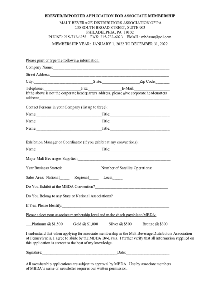 BREWER/IMPORTER APPLICATION FOR ASSOCIATE MEMBERSHIP MALT BEVERAGE DISTRIBUTORS ASSOCIATION OF PA 230 SOUTH BROAD STREET, SUITE 903 PHILADELPHIA, PA 19102 PHONE: 2157326258 FAX: 2157326023 EMAIL: