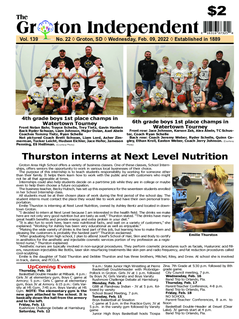 TheGr ton Independent$2South DakotaVol. 139No. 22 Groton, SD Wednesday, Feb. 09, 2022 Established in 18894th grade boys 1st place champs in Watertown Tourney6th grade boys 1st place champs in Watertown