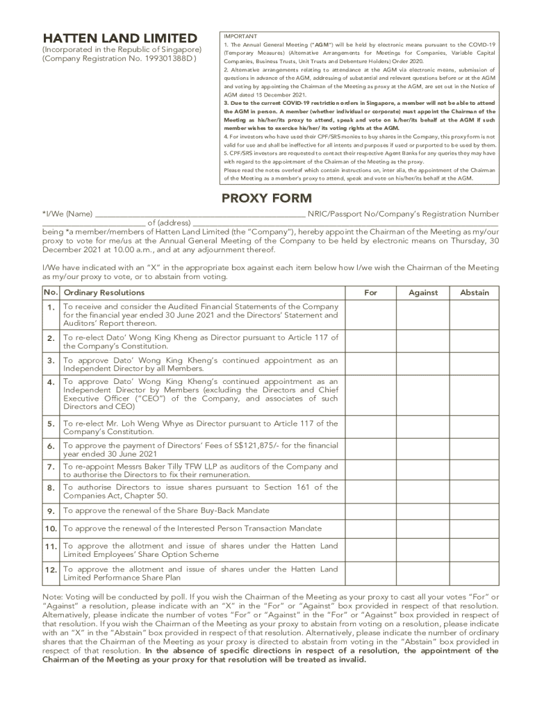 HATTEN LAND LIMITED(Incorporated in the Republic of Singapore) (Company Registration No. 199301388D )IMPORTANT1. The Annual General Meeting (AGM) will be held by electronic means pursuant to the COVID19