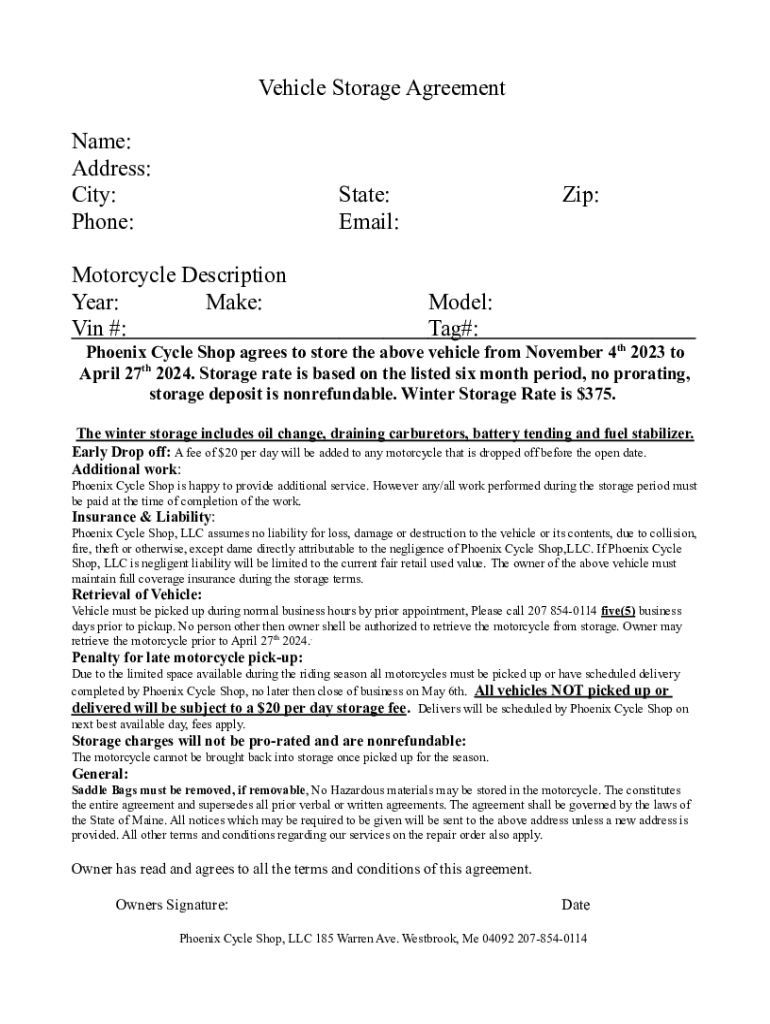 Tag#:Phoenix Cycle Shop agrees to store the above vehicle from November 4th 2023