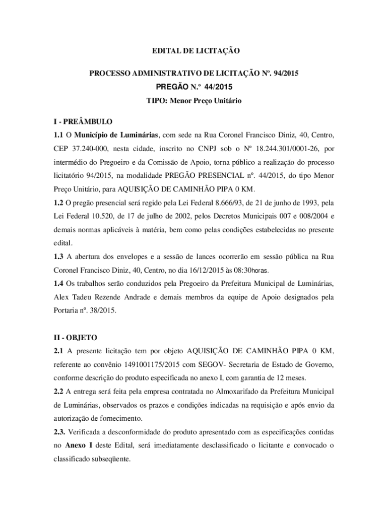 EDITAL DE LICITAO PROCESSO ADMINISTRATIVO DE LICITAO N. 94/2015 PREGO N. 44/2015 TIPO: Menor Preo Unitrio I PREMBULO 1.1 O Municpio de Luminrias, com sede na Rua Coronel Francisco Diniz, 40, Centro,