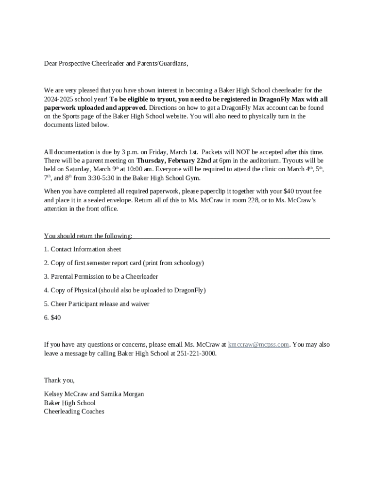 The We are officially kicking off our... - Baker Cheerleading is a fillable form in MS Word extension that can be completed and signed for specific purposes. Next, it is provided to the relevant addressee in order to provide certain information of any kinds. The completion and signing may be done or with a trusted application like PDFfiller. These services help to complete any PDF or Word file without printing them out. It also lets you edit its appearance for your needs and put a legal digital signature. Once finished, you send the We are officially kicking off our... - Baker Cheerleading to the recipient or several recipients by email and even fax. PDFfiller offers a feature and options that make your Word form printable. It includes a variety of settings when printing out appearance. No matter, how you deliver a form after filling it out - in hard copy or by email - it will always look professional and clear. In order not to create a new file from the beginning over and over, turn the original Word file as a template. Later, you will have an editable sample.