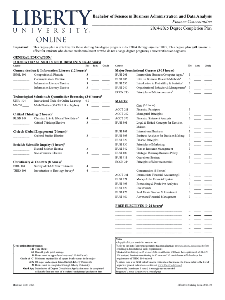 Bachelor of Science in Business Administration and Data Analysis Finance Concentration 20242025 Degree Completion PlanImportant:This degree plan is effective for those starting this degree program