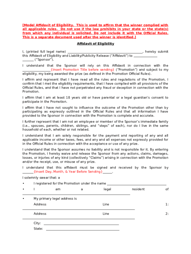 The Free Affidavit of Eligibility Template is a Word document that should be submitted to the required address to provide some information. It has to be filled-out and signed, which can be done manually, or using a particular software like PDFfiller. This tool allows to fill out any PDF or Word document right in the web, customize it depending on your requirements and put a legally-binding electronic signature. Once after completion, user can easily send the Free Affidavit of Eligibility Template to the relevant recipient, or multiple ones via email or fax. The template is printable too thanks to PDFfiller feature and options proposed for printing out adjustment. Both in digital and in hard copy, your form will have got clean and professional outlook. You can also save it as the template for further use, without creating a new document again. Just amend the ready template.
