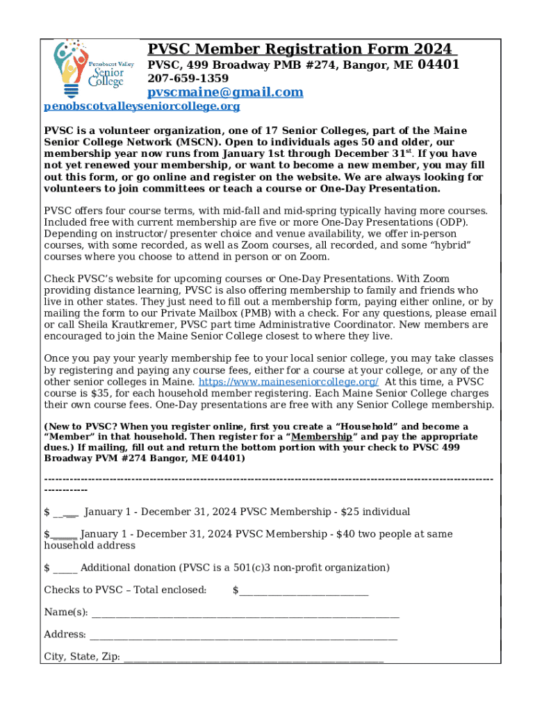 Instructions for the form How to Register for an Activity - Penobscot Valley Senior College