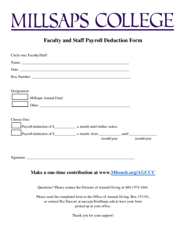 ResetFaculty and Staff Payroll Deduction Form Circle one: Faculty/Staff Name: ___ Date: ___ Box Number: ___Designation: ___ Millsaps Annual Fund ___ Other ___Choose One: ___Payroll deduction of $___