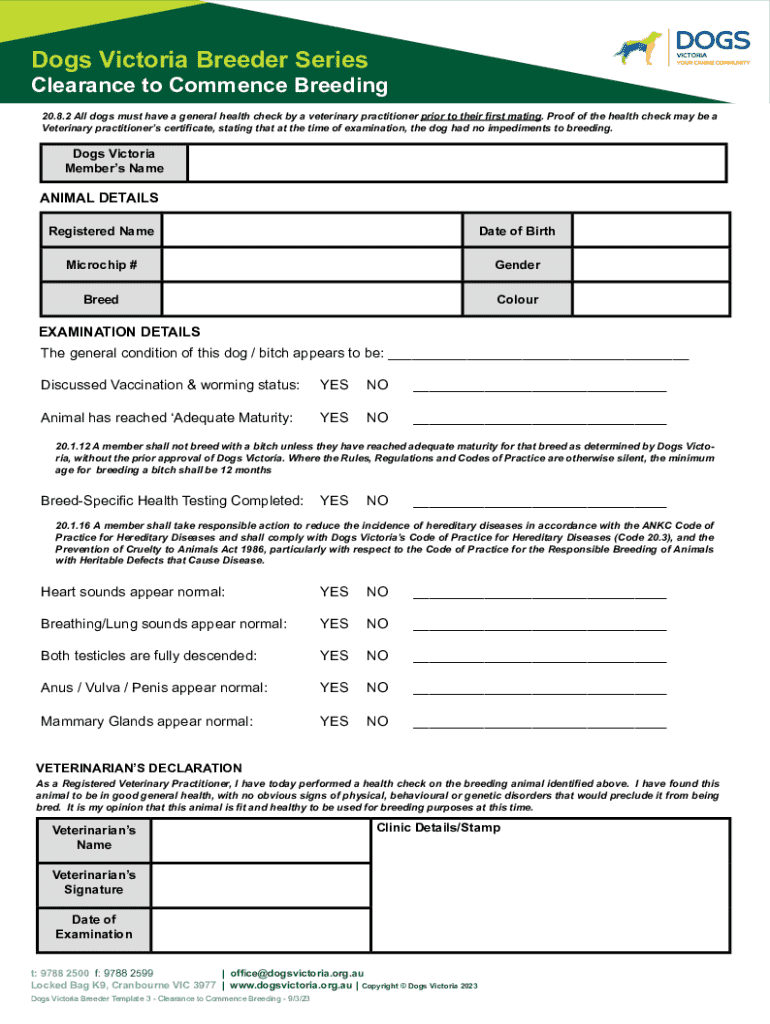 Dogs Victoria Breeder SeriesClearance to Commence Breeding 20.8.2 All dogs must have a general health check by a veterinary practitioner prior to their first mating. Proof of the health check may