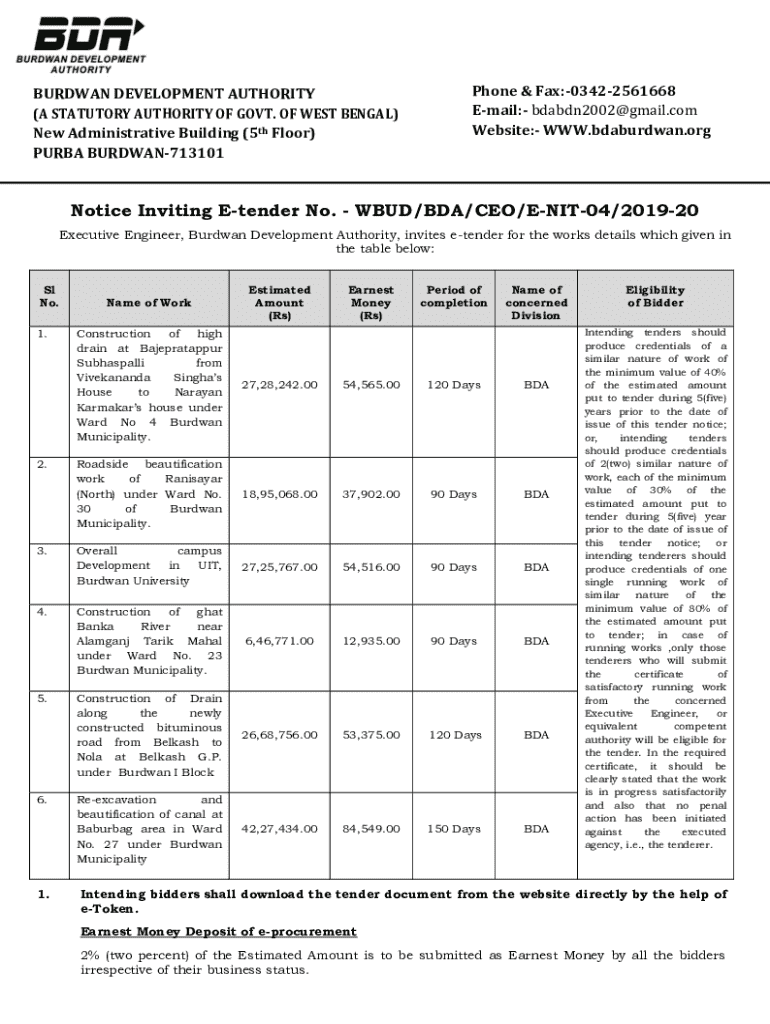 BURDWAN DEVELOPMENT AUTHORITY (A STATUTORY AUTHORITY OF GOVT. OF WEST BENGAL) New Administrative Building (5th Floor) PURBA BURDWAN713101Phone & Fax:03422561668 Email: bdabdn2002@gmail.com Website: