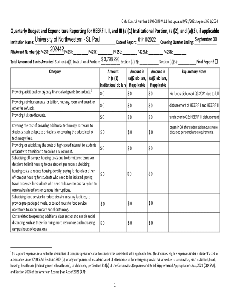 OMB Control Number 18400849 V.1.1 last updated 9/21/2021 Expires 3/31/2024QuarterlyBudgetandExpenditureReportingforHEERFI,II,andIII(a)(1)InstitutionalPortion,(a)(2),and(a)(3),ifapplicable September