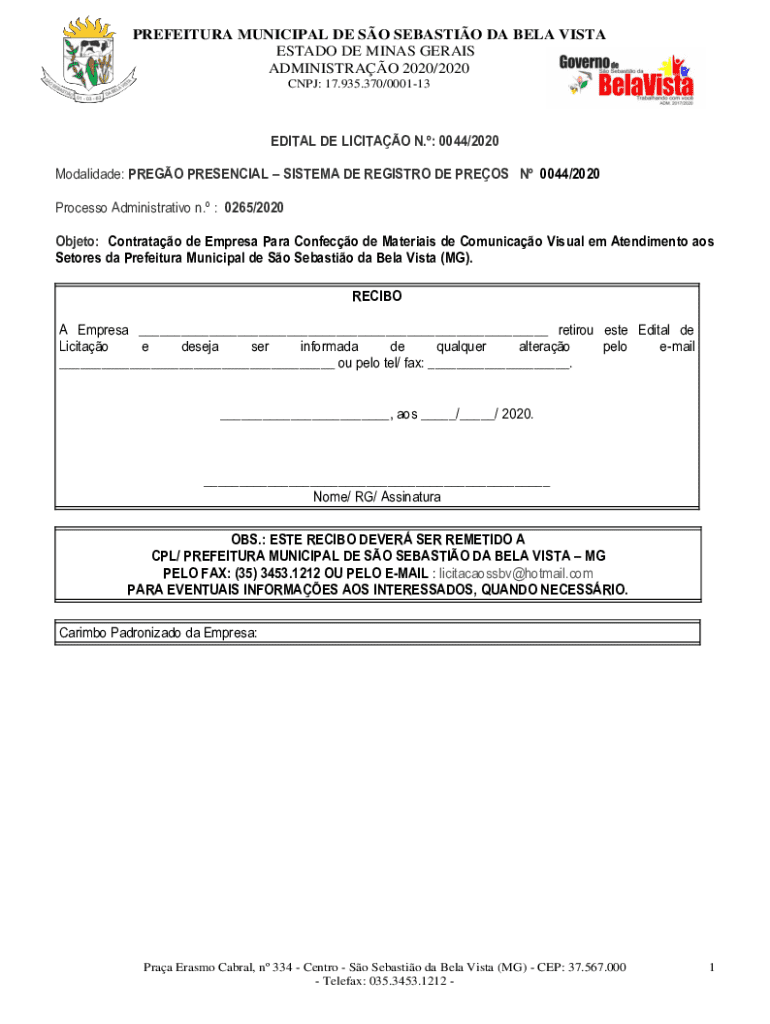 PREFEITURA MUNICIPAL DE SO SEBASTIO DA BELA VISTA ESTADO DE MINAS GERAIS ADMINISTRAO 2020/2020 CNPJ: 17.935.370/000113EDITAL DE LICITAO N.: 0044/2020 Modalidade: PREGO PRESENCIAL SISTEMA DE REGISTRO